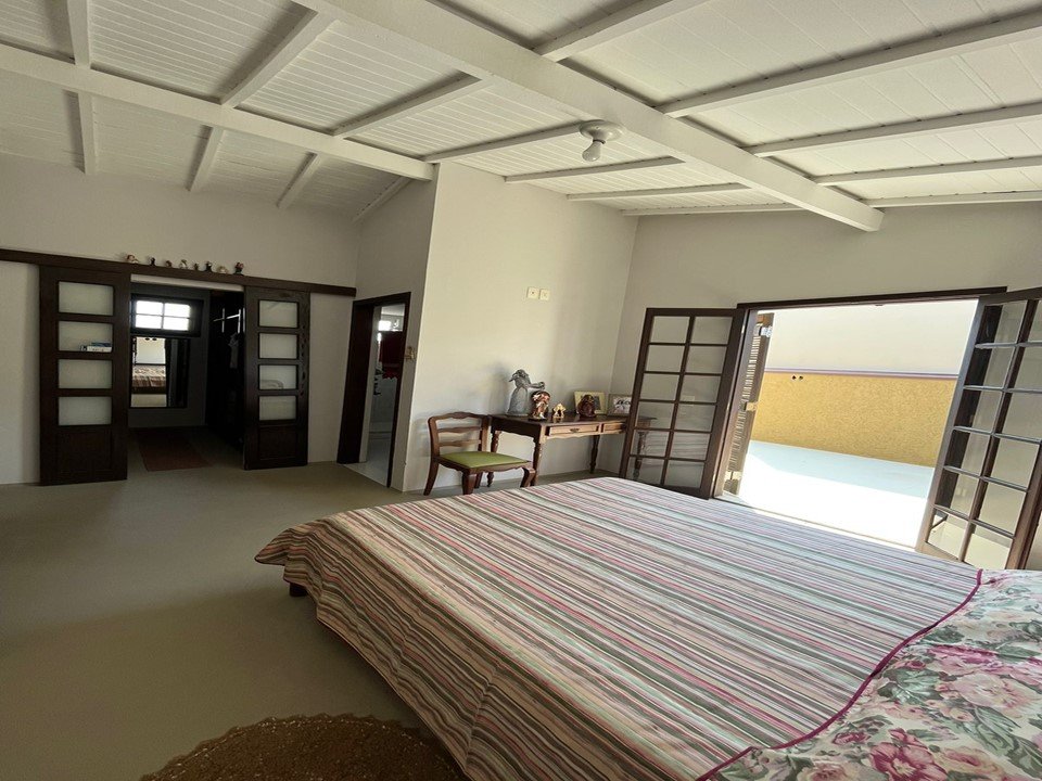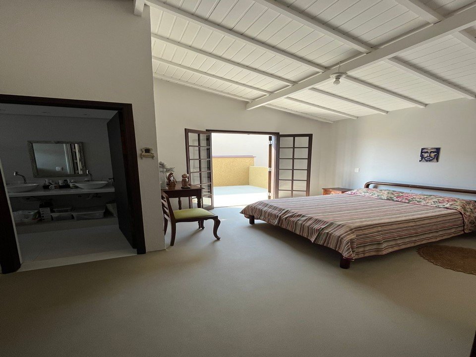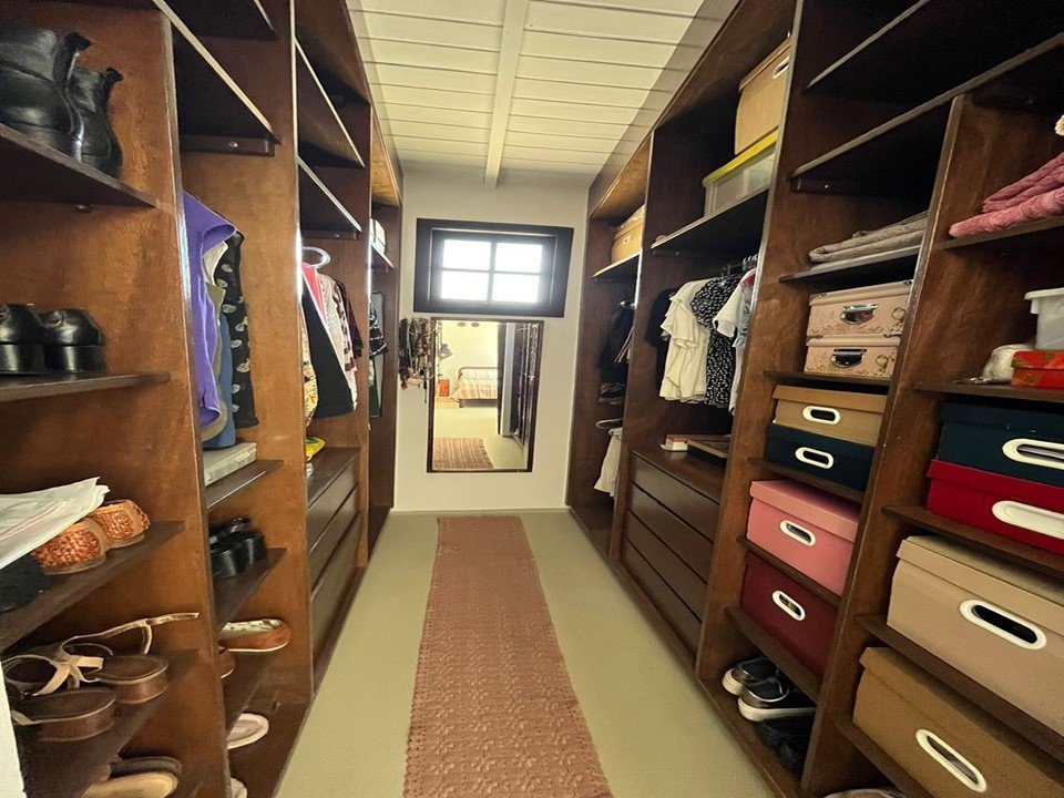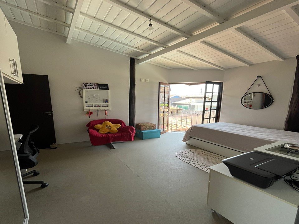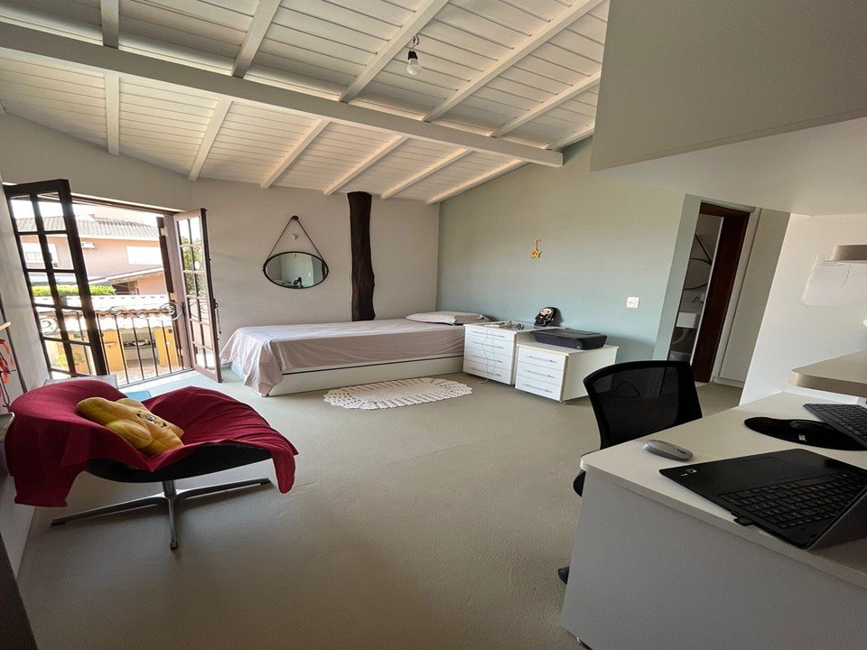 No pavimento superior, três suítes, sendo uma master com closet e varanda. Há também uma sala de TV ou escritório.