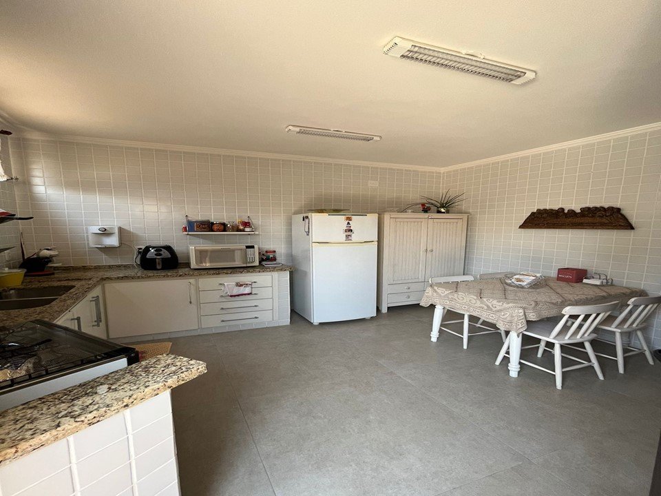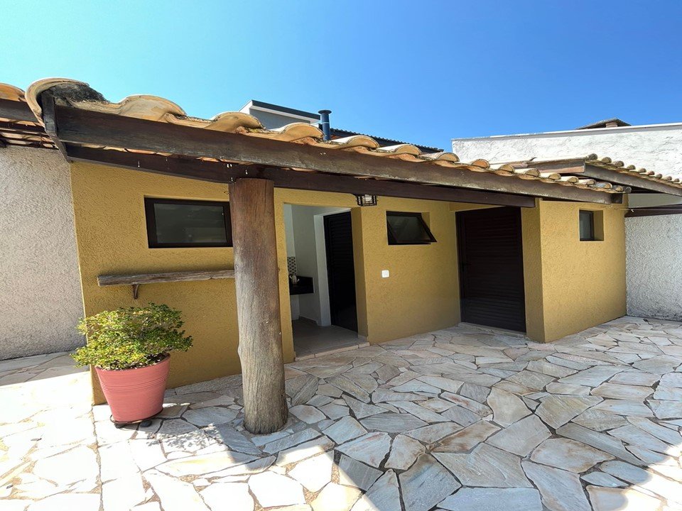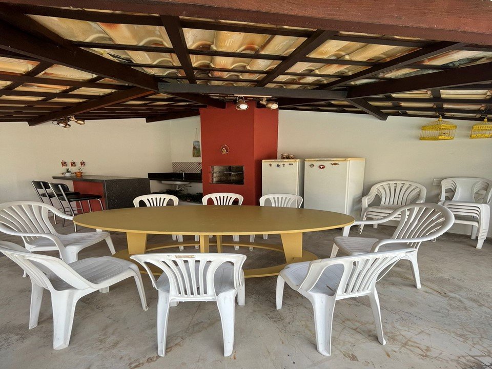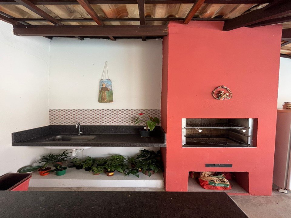 A área gourmet é coberta e conta com churrasqueira, pia e balcão de apoio.