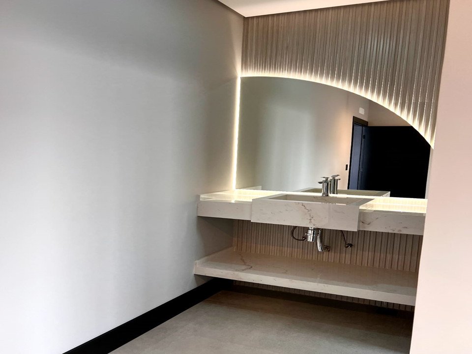 - Pias dos lavatórios esculpidas em porcelanato (suíte master e demi são cubas duplas)