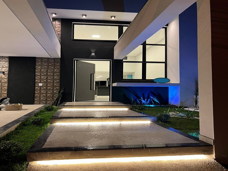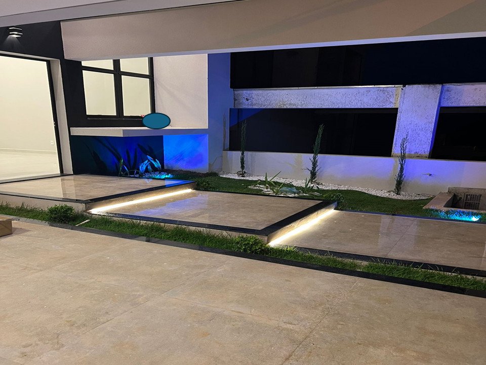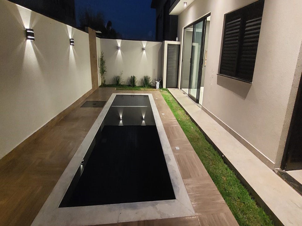 - A área externa possui uma piscina em alvenaria com iluminação em LED, prainha e jatos de hidro, preparada para aquecimento. O jardim frontal, lateral e ao fundo, com iluminação refletiva, traz um toque de beleza e tranquilidade ao ambiente.