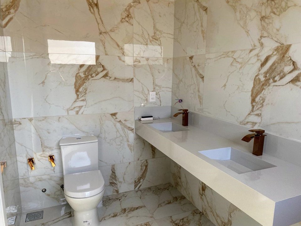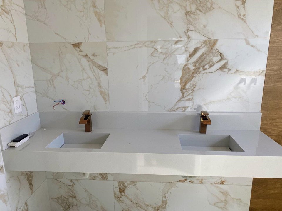 Banheiros com bancadas esculpidas em granito, cubas, box de vidro temperado, ducha e assento
