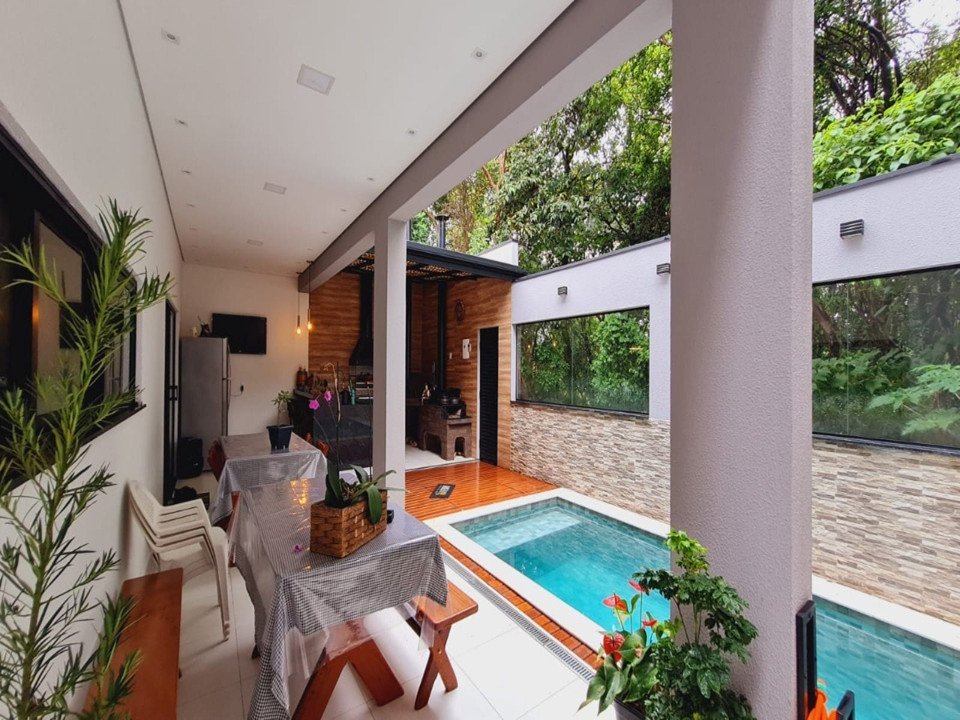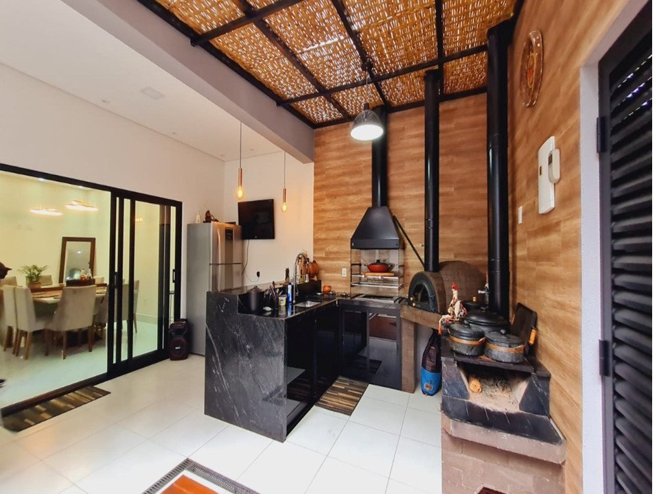 • Espaço coberto com churrasqueira, forno de pizza, fogão a lenha, pia e armários