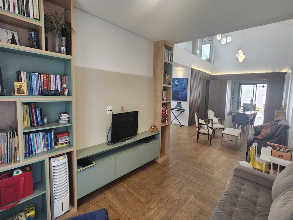 Sala de Estar e Jantar: Pé direito duplo, integradas com a cozinha com ilha e repleta de armários.