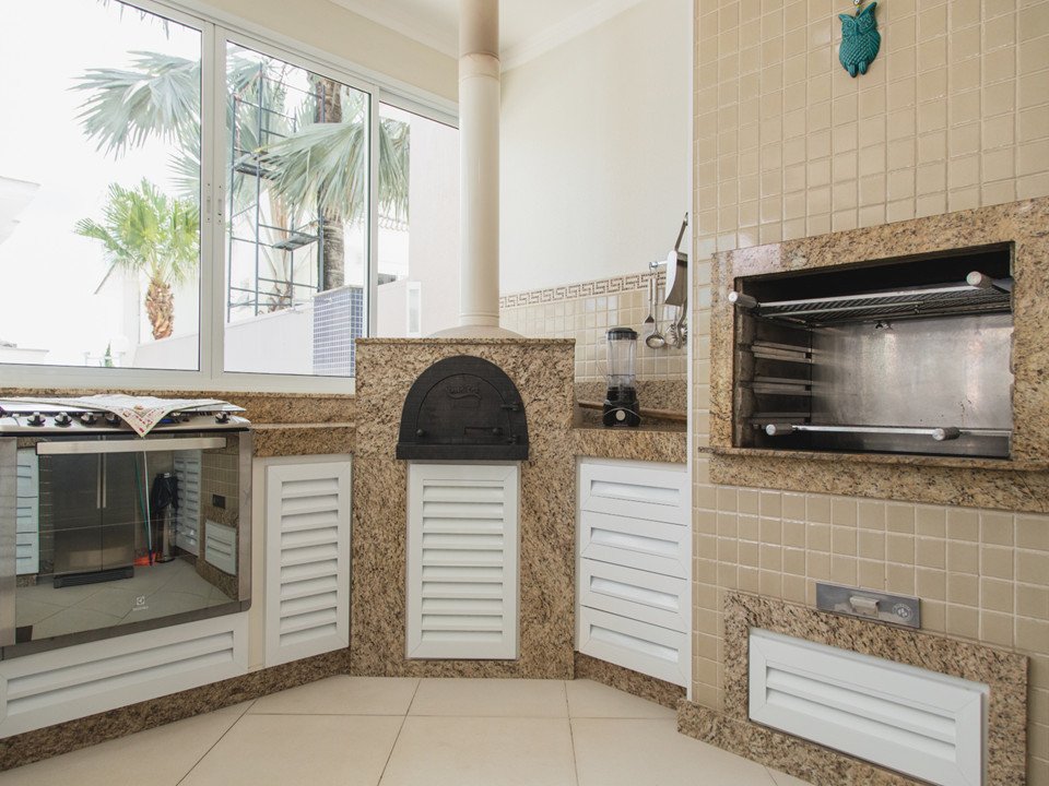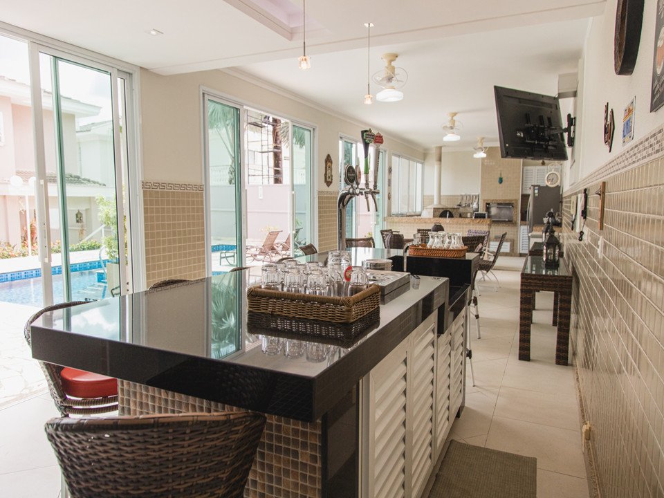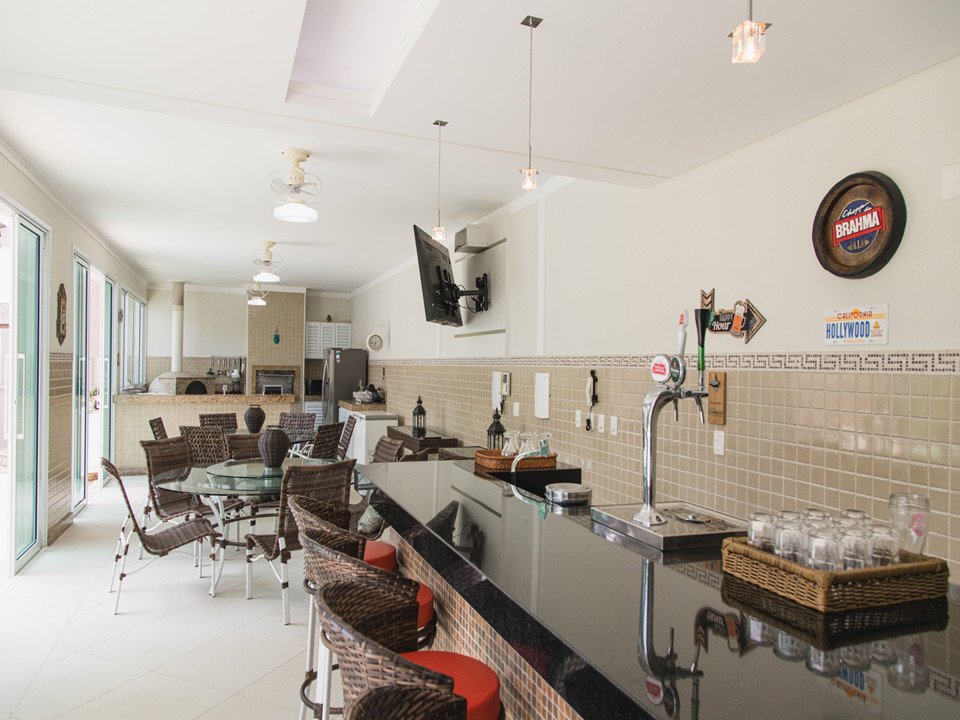 Espaço gourmet completo com churrasqueira, forno, fogão e ilha com chopeira e bicos