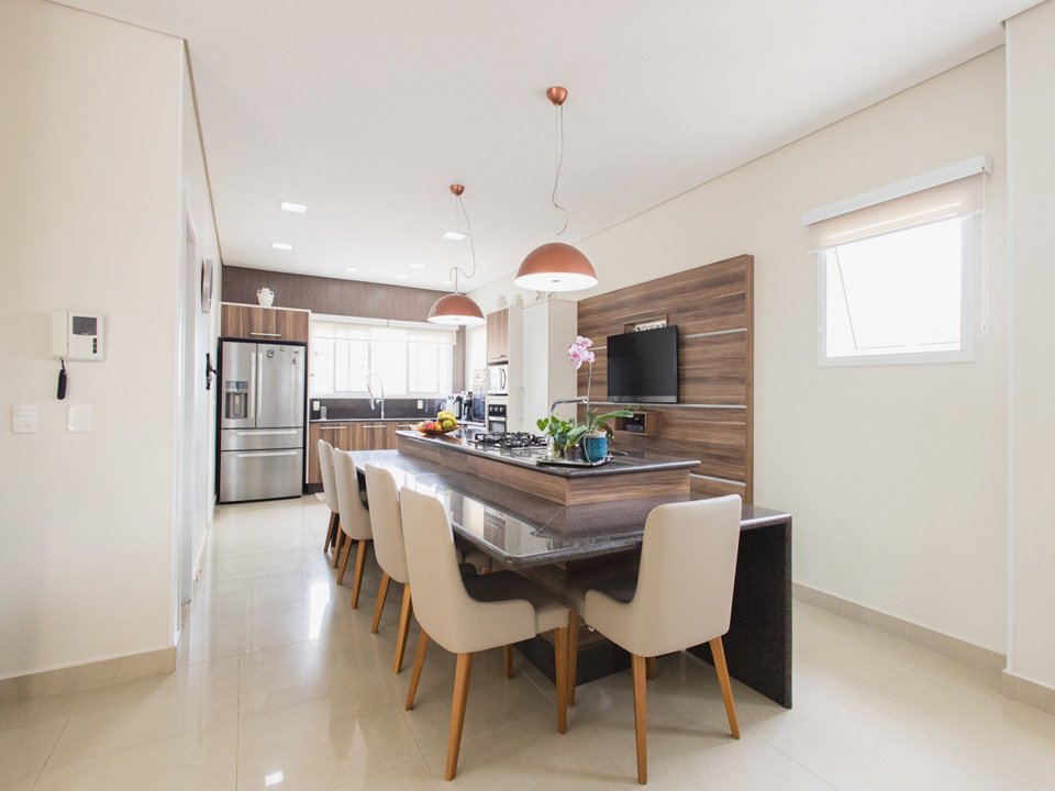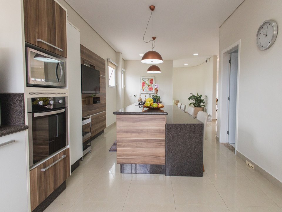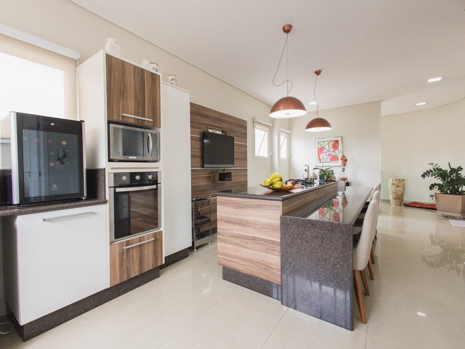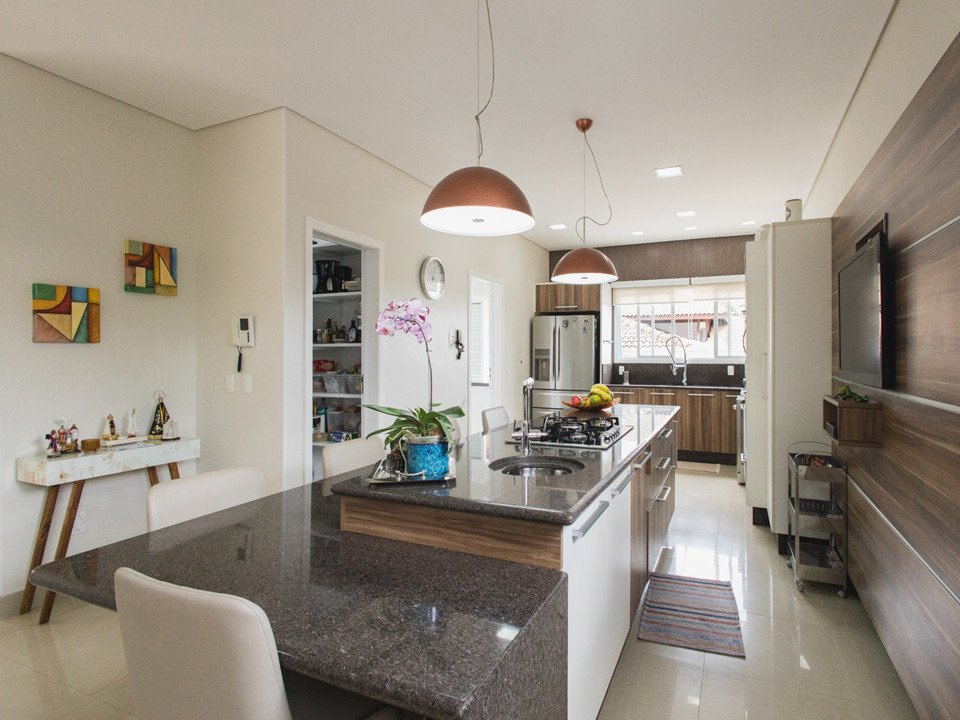 Cozinha moderna com ilha de preparo e despensa