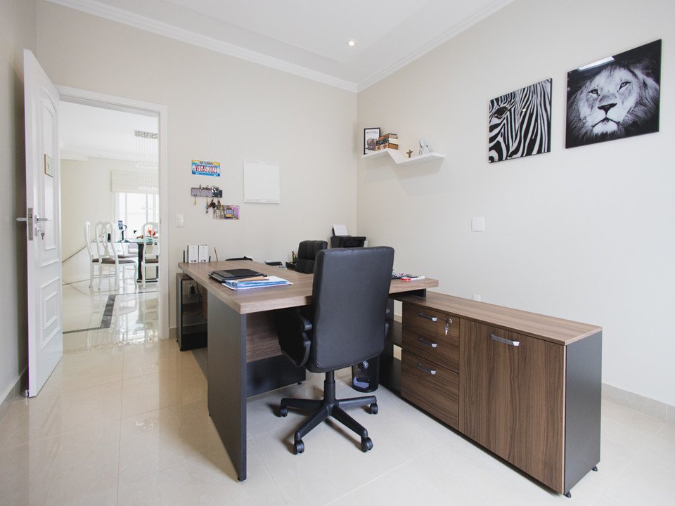 Sala de estar com lareira, sala de jantar, escritório e sala de TV
