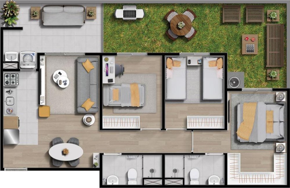 - Térreo de ambas as torres com 7 apartamentos, sendo 3 apartamentos Garden por torre, totalizando 6 apartamentos Garden + área de lazer