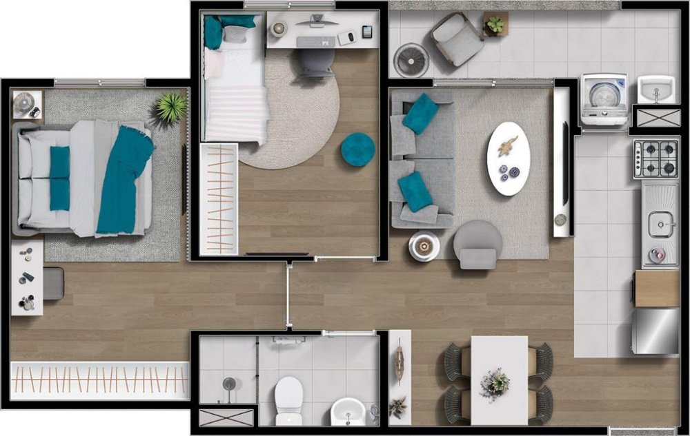 - 2 dormitórios de 48,55 m²: 58 apartamentos, sendo 2 unidades Garden;