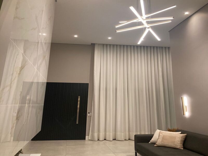 Espaços de Convivência: Escritório, sala de TV fechada e sala de estar com pé direito alto, cortina elétrica e lareira a gás.