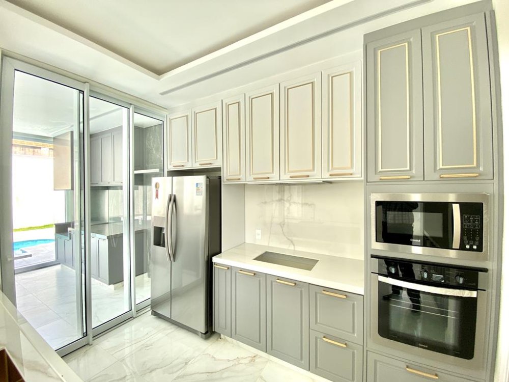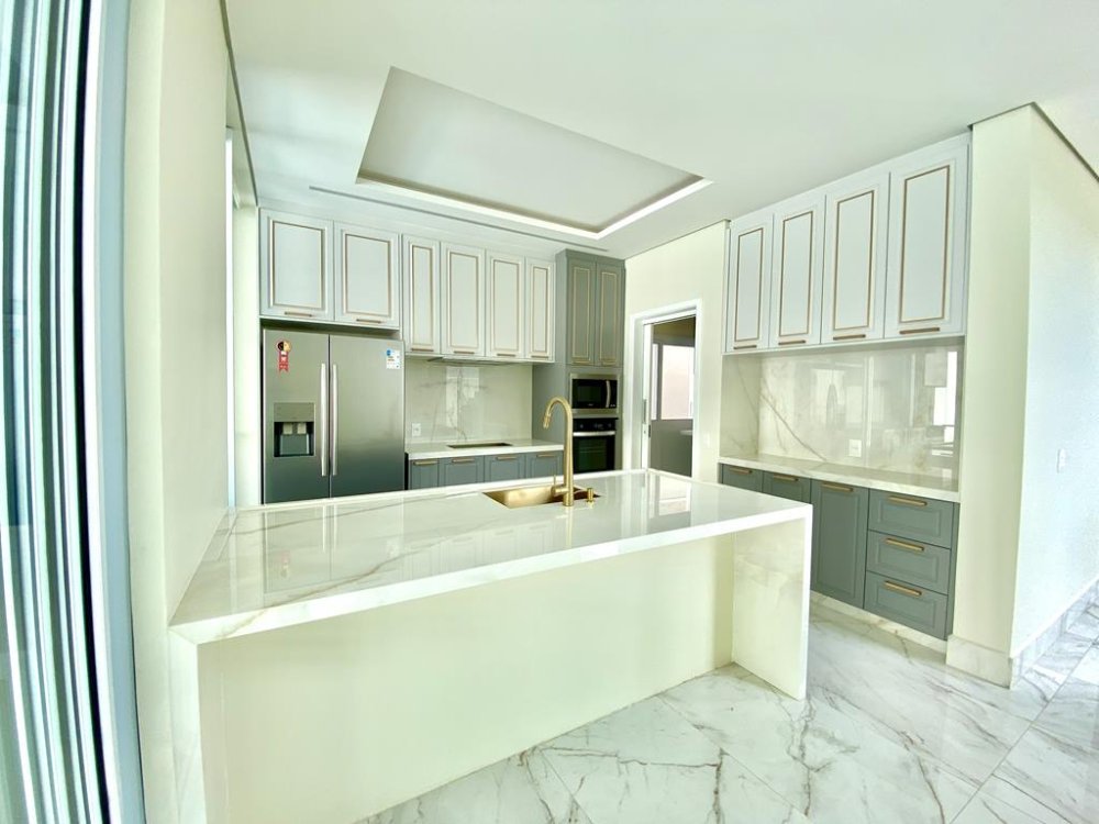 - Cozinha com balcão e revestimento Lamina Calacata Gold completa com Moveis planejados, fogão, forno, micro-ondas, geladeira side by side, coifa embutida no móvel, lava-louças.