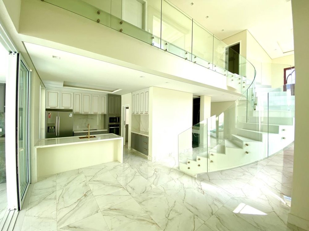 -Escada curvada em vidro e Mármore Branco Prime, seguindo mesmo padrão em todo mezanino