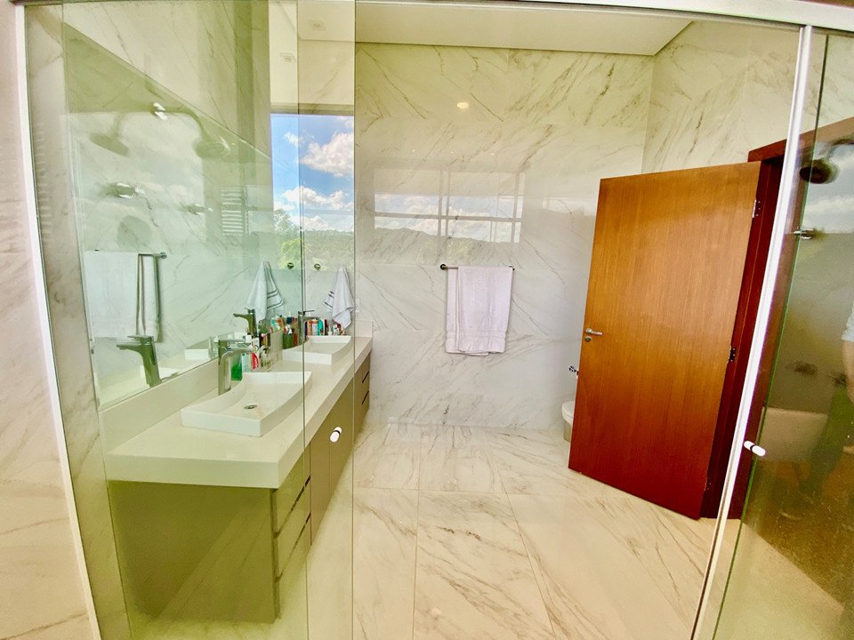 Suíte master com closet, banheiro com duas cubas na bancada e dois chuveiros